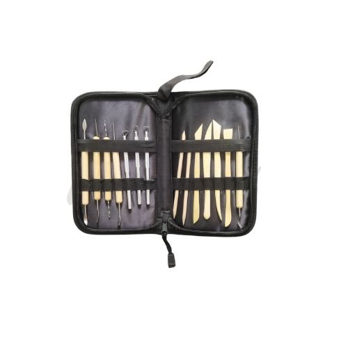 Estuche de tela con 14 herramientas (mini devastadores, estecas de madera y metal, punzón)